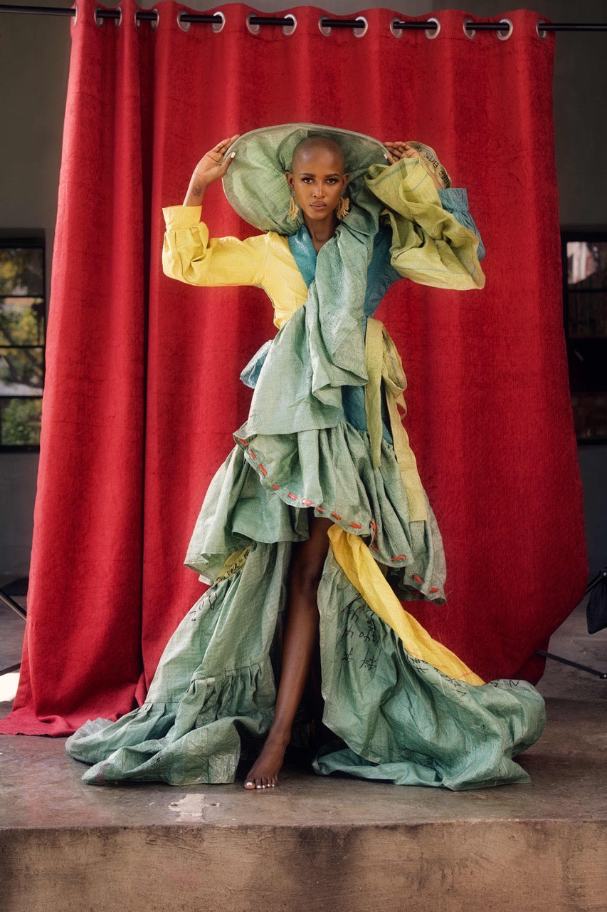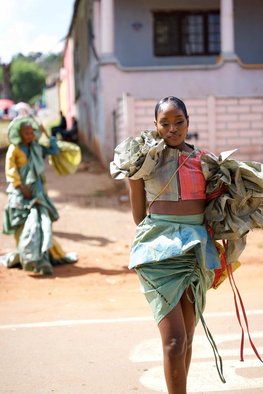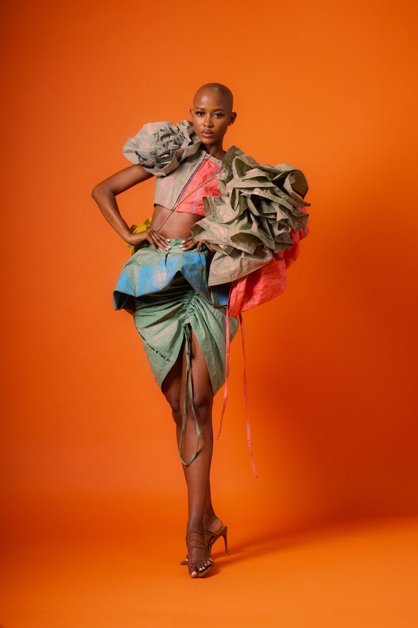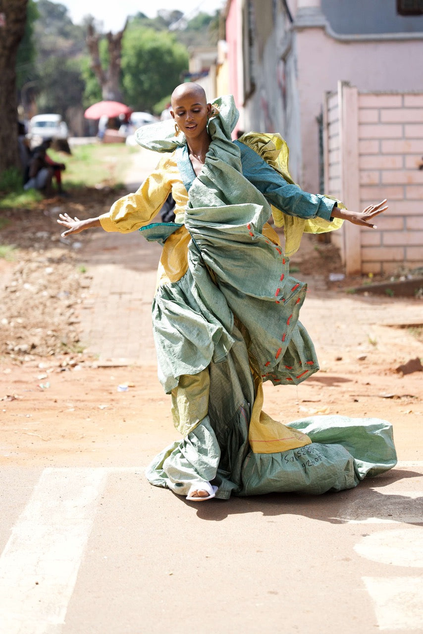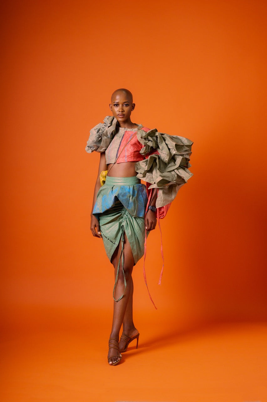 MATLAKALA SS ‘26 is a radical, avant-garde exploration of waste, value, and transformation. Born from discarded cargo packaging, the collection challenges ideas of what is considered “throwaway” by elevating the remnants of global trade into powerful sculptural fashion. Every garment becomes a provocation: a reminder that what we label as trash still carries history, movement, and potential.
