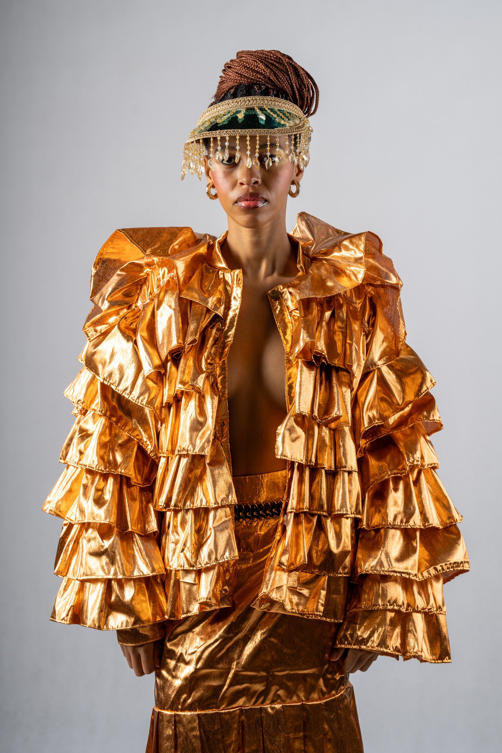 Turn heads in this lavish, sheer gold organza jacket, designed for dramatic flair and luxurious texture. Featuring multiple cascading ruffles, this lightweight jacket drapes elegantly across the shoulders and torso, offering fluid movement and a showstopping silhouette. Ideal as a statement topper for eveningwear, performances, or any occasion where glam is a must—simply pair with your sleekest base layer, and let the ruffles do the talking.